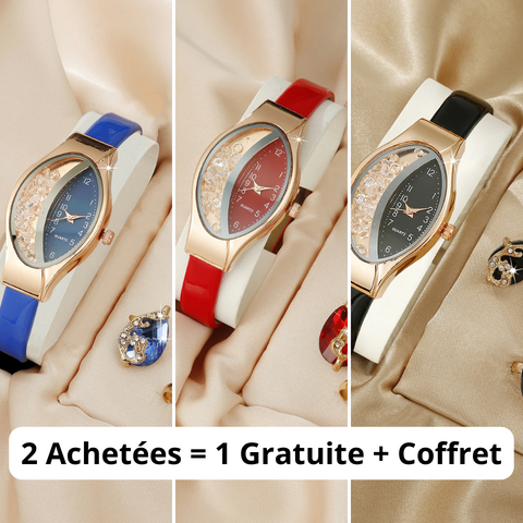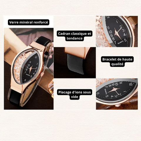 La Montre : Avec son cadran sophistiqué, elle peut être portée seule pour un look décontracté en journée, ou associée au collier et à la bague pour un look plus élégant le soir. Vous pouvez également la porter avec les boucles d'oreilles pour un look sophistiqué et complet. Grâce à ses couleurs variées, elle s'adapte à toutes les tenues et s'intègre parfaitement à votre style personnel.