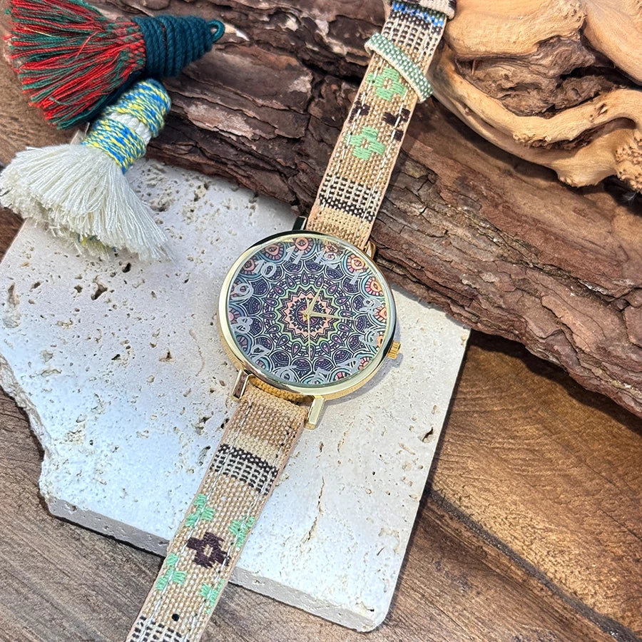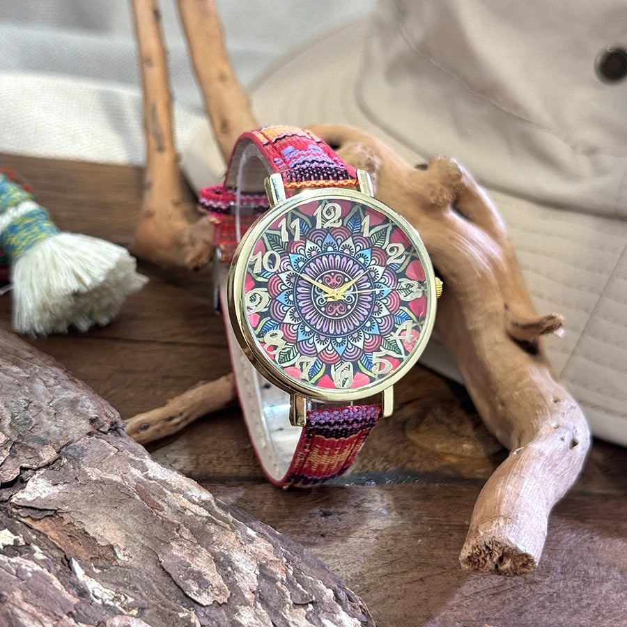 Sublimez votre poignet avec cette pièce d'horlogerie unique, où l'élégance classique rencontre l'esprit libre du style bohème. Ce garde-temps se distingue par son cadran envoûtant aux motifs mandala, véritable kaléidoscope de couleurs profondes et mystiques, encadré par un boîtier doré à la finition soignée.